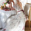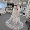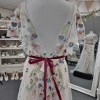 The dress buttons at the back and is made up of two layers. The bottom layer is a strappy, ivory coloured slip with delicate white lace overlay, and the top layer is the white netting with floral embroidery. It's very lightweight and would be perfect for a summer wedding or someone who wants something a bit different! The back has a very slight train with beautiful embroidery.