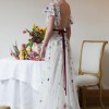 This gorgeous bridal gown inspired by modern folklore is crafted from Tillie Chantilly on soft netting. It features an illusion neckline, flutter sleeves, pearl buttons, and a velvet ribbon sash.