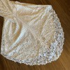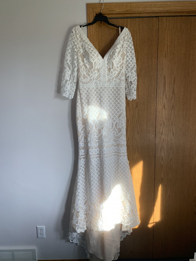 Brimming with bohemian ease, Sloane is a casual fit and flare wedding dress constructed from a textured stretch cotton lace, which is as comfortable as it is distinctive. The organic patterned lace leaves a gently scalloped edge at the hem of the chapel length train, as well as at the end of the three-quarter sleeves. A V-neckline in both the front and back are universally flattering.