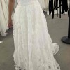 Never worn outside of trying on and still has the tags. Unaltered. The ruffles have detachable buttons, but about half of them need to be replaced or can wear the dress without. I am holding the dress in the back to show it more fitted, but it’s an unaltered size 16. Sadly, alterations cost too much for me (16 to 10) so I went with a different dress.