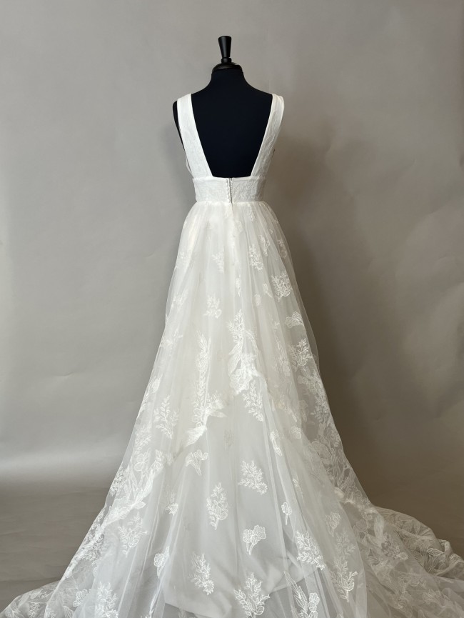 Fashion-forward and chic, Style D3665 is a Grecian-inspired gown made for a goddess. From the gathered and sheer tulle shoulder straps, a low plunging V-neckline meets the bandeau waist, all with a flattering gathered effect. In the back, the straps sleekly fold into the waistline, creating an elegant square back detail. From the gathered and tucked waistband, sheer gauzy layers of 3D florals, frothy tulle and Georgette satin form a soft and layered A-line skirt covered in whimsical florals. For a final finishing touch, a sexy side slit adds a touch of contemporary appeal to make this wedding gown an absolute eye catcher.