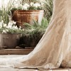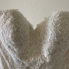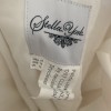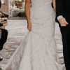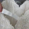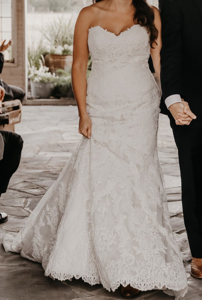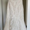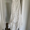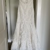 Professionally cleaned after wearing once and stored in Keepsake box since. Scalloped lace on bottom. It has a bustle to pull up the train, and can also be let down. It has a strap on the inside to help hold up the weight of the dress. It has decorative buttons on the back of the dress, over the zipper. It is 55” from top of dress (top of chest of dress) to the bottom.