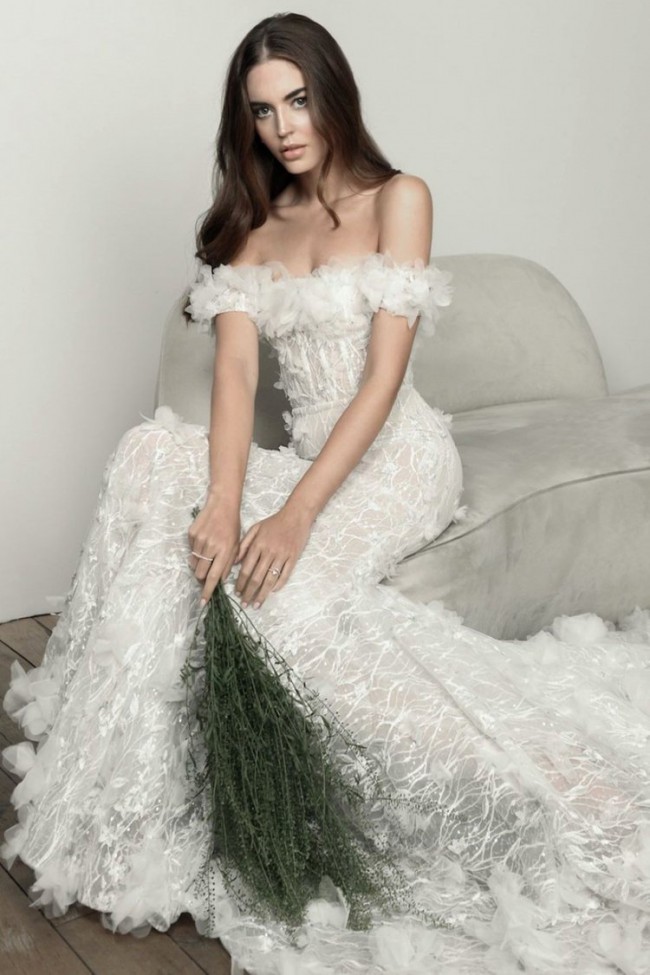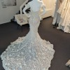 Lee Petra Grebenau's Alessia gown is a stunning testament to high fashion and timeless elegance. This masterpiece is celebrated for its exquisite craftsmanship and attention to detail. The gown features a form-fitting bodice that accentuates the natural curves of the wearer. It is embellished with intricate beadwork and silk chiffon floral detail around the bustline. It also has arm cuffs matching the floral detail of the neckline giving the illusion that it is off the shoulder.