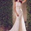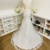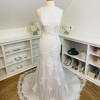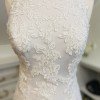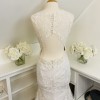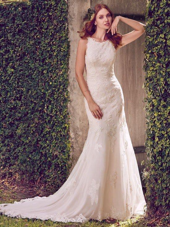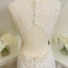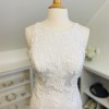 Lace motifs cascade over tulle and Inessa Jersey in this sleeveless sheath wedding gown, featuring a jewel neckline and illusion keyhole back. Finished with crystal buttons and zipper closure. This sample has a few loose buttons and loops that can easily be reinforced by a seamstress. Other than this the gown is in great condition. The color is ivory (lace) over soft petal (jersey lining).