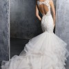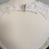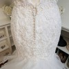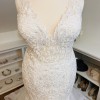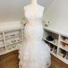 This gorgeous Kayla designer wedding dress features sculptured lace appliqués on an intricately designed bridal gown. The v-neck complements the mermaid silhouette of this designer wedding dress. An open keyhole back and horsehair trimmed ruffle skirt completes the look.