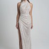 Lee Petra Grebenau Allure Halter dress. A glamorous draped light silver sequin dress. With a high collar, slit and a deep open V back. Lined with nude tulle bodysuit.