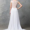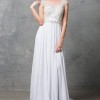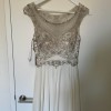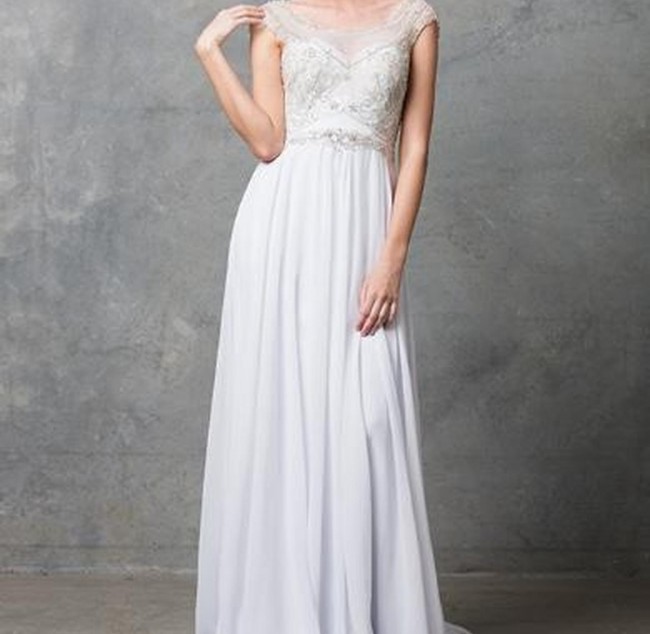 The stunningly light weight dress is beautifully embroidered with beads on a boat neck style bodice. Featuring a semi-embellished tulle covered low back, with crystal detailing waistband falling into an effortless gathered georgette skirt. An invisible side zip is in keep with the seamless finish and semi-chapel train for added volume.