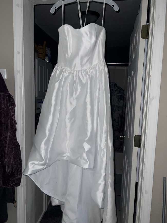 Brand new David’s bridal dress! In perfect condition and was never worn, still has tags. Hi-lo clean white dress