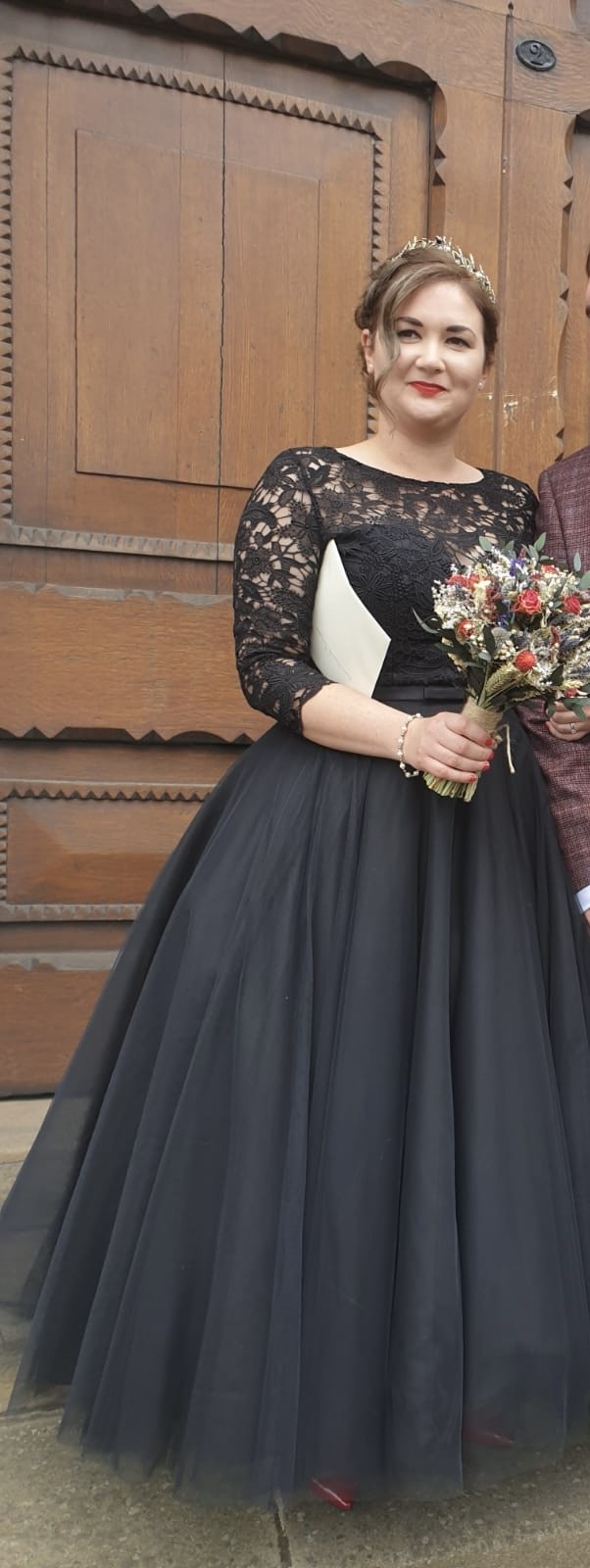The top portion is crochet lace with bone inlay and a sweetheart neckline.