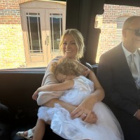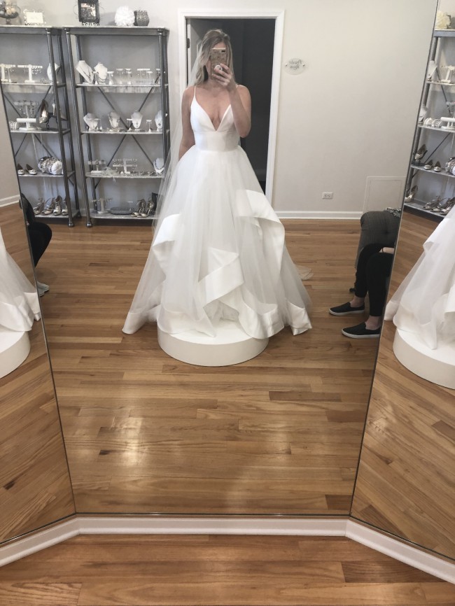 Never worn Hayley Paige Andi Gown. The top has been customized so it isn’t as low cut as the original sample that was tried on in the first photo. See the last photo for raised neckline.