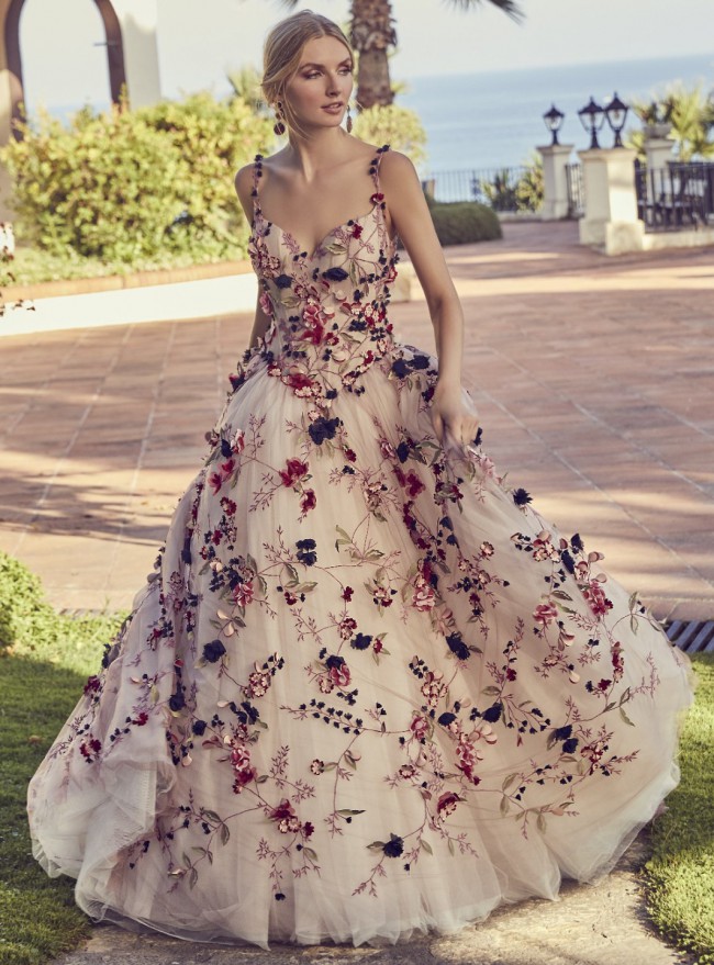 If you're a bold bride looking for something different, you'll love this colourful ballgown wedding dress featuring beautiful 3D floral appliqués.