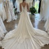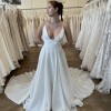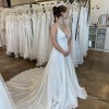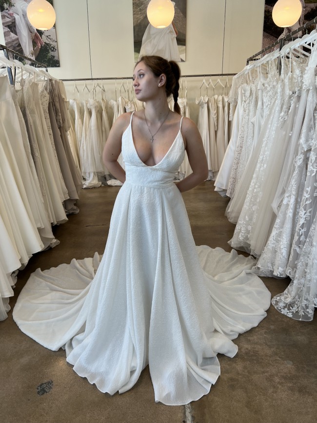 The Persephone V-neck wedding dress is fit for a modern day princess. The clean lines of her delicate V-neck bodice are elevated by the romantic texture of Coco jacquard fabric cut in a full A-line silhouette. Covered buttons down to the hem add a classic bridal finish. Item was a floor sample, may have minimal signs of wear. Dress is like new. Has never been altered.