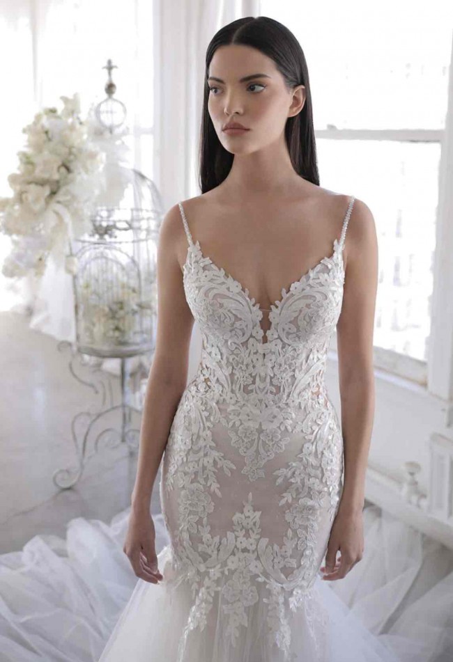 Olexa is an ex sample in ivory with nude and sparkle underlining. Please see last picture for colour. The designer photos are in the lighter tone. The bodice is also unlined. This sample is in excellent condition. This is a size 14 which generally fits a 12/small 14.