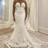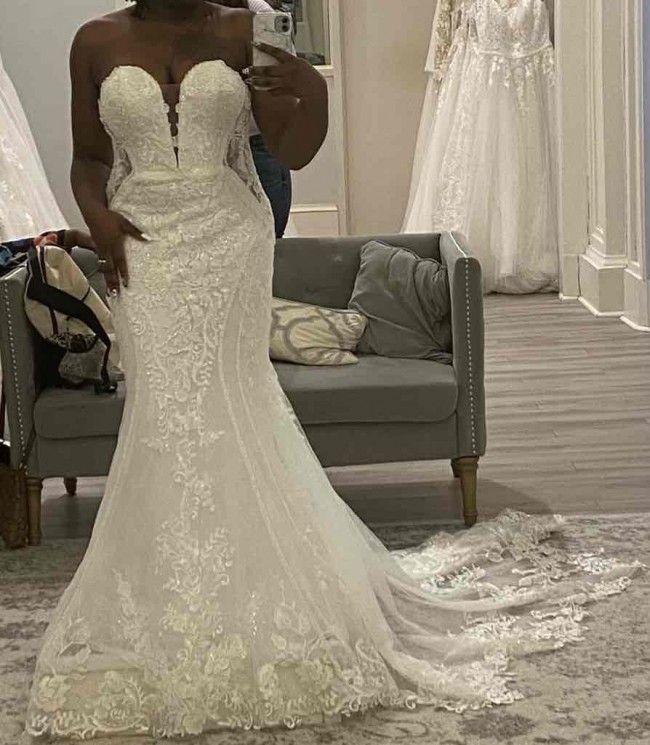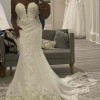 Description: This gown has vintage-inspired lace patterns from head to toe, with striking linear curves and lines accentuating the body's beautiful form, with encrusted beaded details on the bodice add a subtle shimmer. The gown fit perfectly, only minor alterations in the boob area and the length of the gown. Veil included, ivory with sparkles.