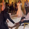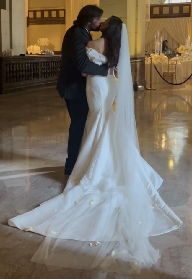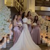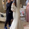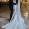 Sleek and classic fit and flare silhouette. This timeless gown features a curved draped neckline and dramatic, detachable off shoulder sleeves. Truly elegant….(including English netting cathedral length veil)