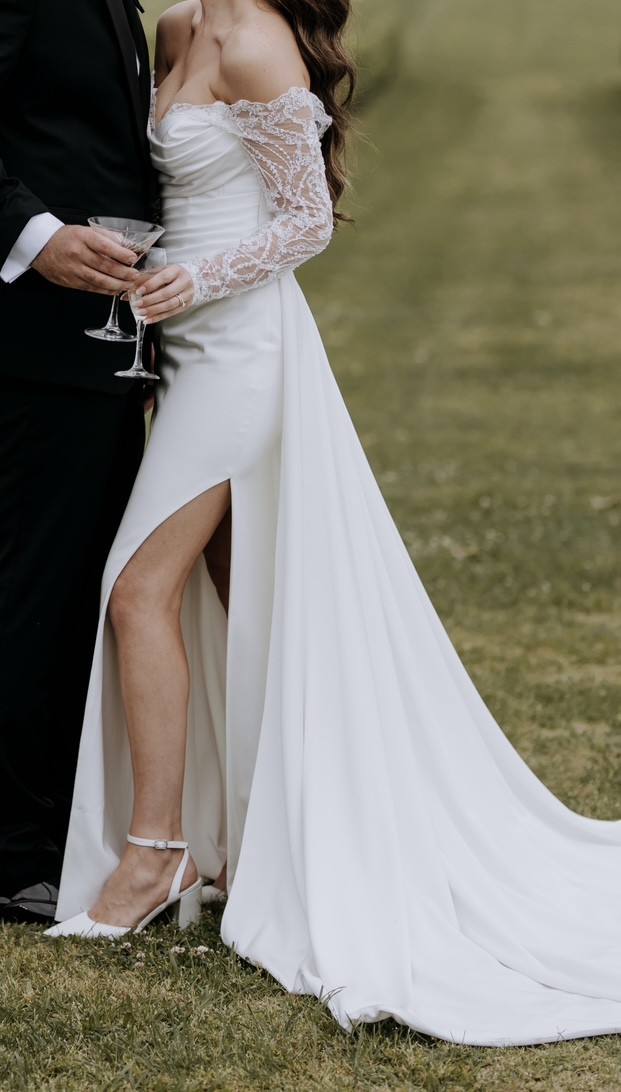 Selling my beautiful wedding dress with detachable train, custom made detachable beaded sleeves and added buttons along back zip.