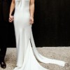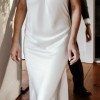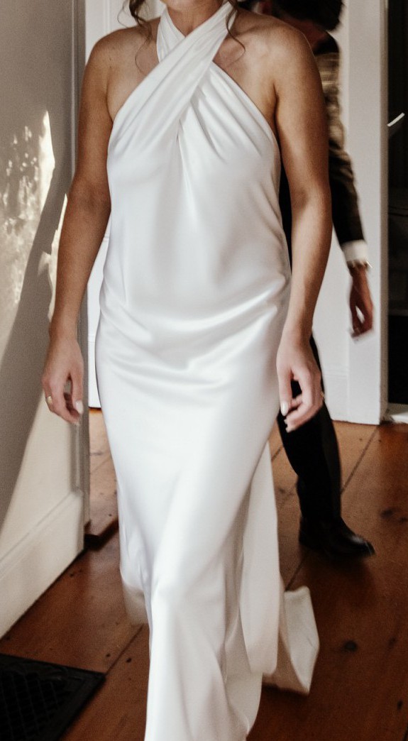 Evoke 90s minimalism with Maras. This relaxed-fit halter crosses at the bust and long neck ties extend to the length of the train. Maras' gentle fit and flare silhouette, low back and satin finish are sleek moments made.