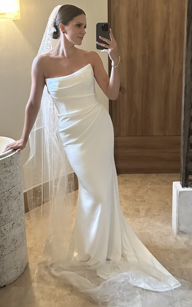 Beautiful Lucia Gown. It’s so flattering and incredibly comfortable. I got a size 4 and it’s a little adjusted. It has a minor flaw on the inside near the end of the tail.
