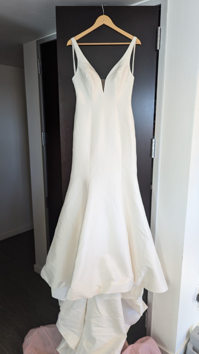 This dress was my first choice for my wedding but unfortunately it did not fit me in the hip (it is closer to 38" in the hip) and I decided to go with a different dress. I took it in for alterations so the skirt's inner slip seams are open around the hip, but no alterations were made and it does not affect appearance of gown. All other measurements align with a size 10. It is a beautiful dress and I would love if it worked for somebody else's big day.