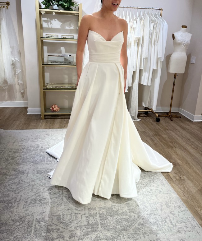This wedding dress is perfect for anyone looking for a classic A-line dress. The material was perfect in person and in professional photos. It made me feel grand and classy walking down the ceremony. The only alteration was for the length of the dress. It’s tailored for 4” heels and I am 5”2. I only wore this dress for 2 hours and changed into a second look after cocktail hour. Dress has already been professional dried clean and in dry cleaner box.
