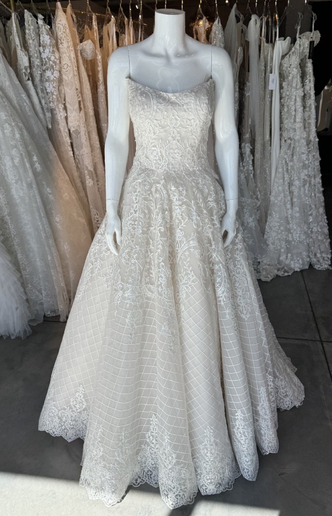 Angel Rivera's Gorgeous gown is a stunning lace ballgown with a structured skirt. This is a sample gown, size 12 that has never been changed or altered from its original sizing. Available to ship ASAP! Let us know if you have any questions!