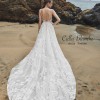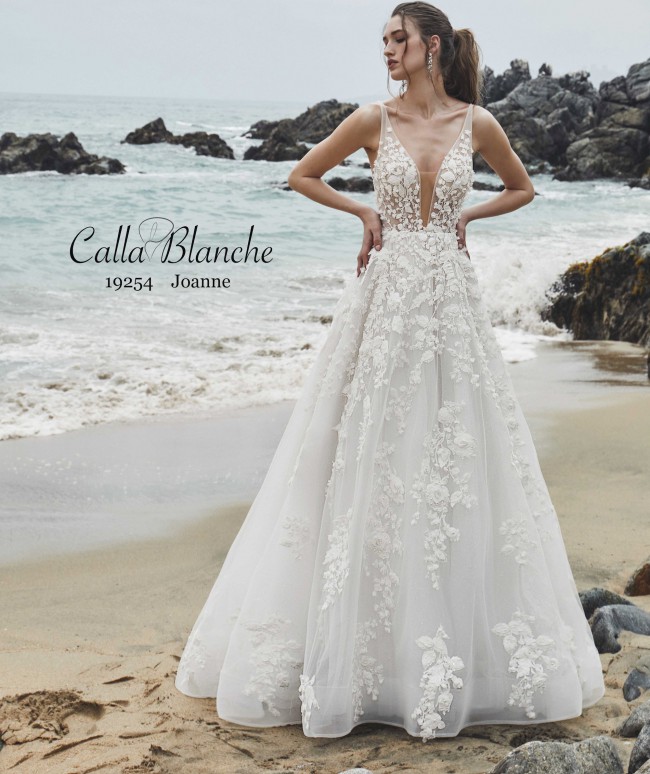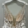 Beautiful aline/ballgown dress with 3D floral lace appliqués throughout and deep v-neck with beaded straps.