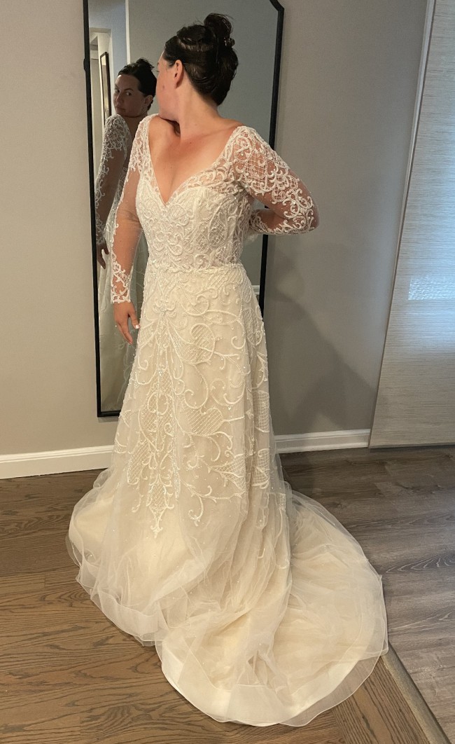 This dress has no alternations with the exception of thin breast padding which cost $300 to insert. This dress was used for an elopement in Italy and worn for a short period time. It has been clean and preserved in a box ready for its next wear! *veil not included.