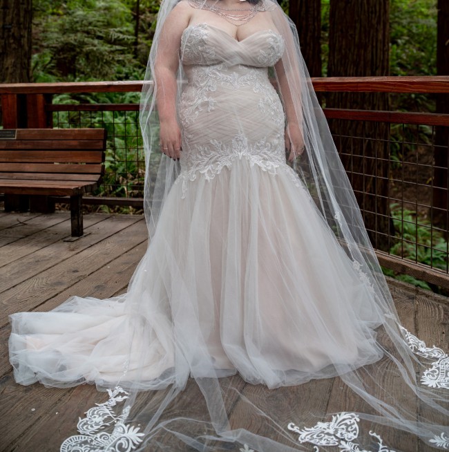 Blush Rebecca Ingram dress. Bought for 2200, selling for the listed price. It has been dry-cleaned. I did add stay stitches and train tie,s so it is not untouched. All work done is reversible on request. I am 5 foot 3, but wore 4-inch platforms to accommodate the height and to avoid getting it altered. So it is still in its original condition. Make me an offer. Veil included. Veil is custom from Etsy so the lace matches the lace on the dress. Would be willing to lower the price if picked up locally.