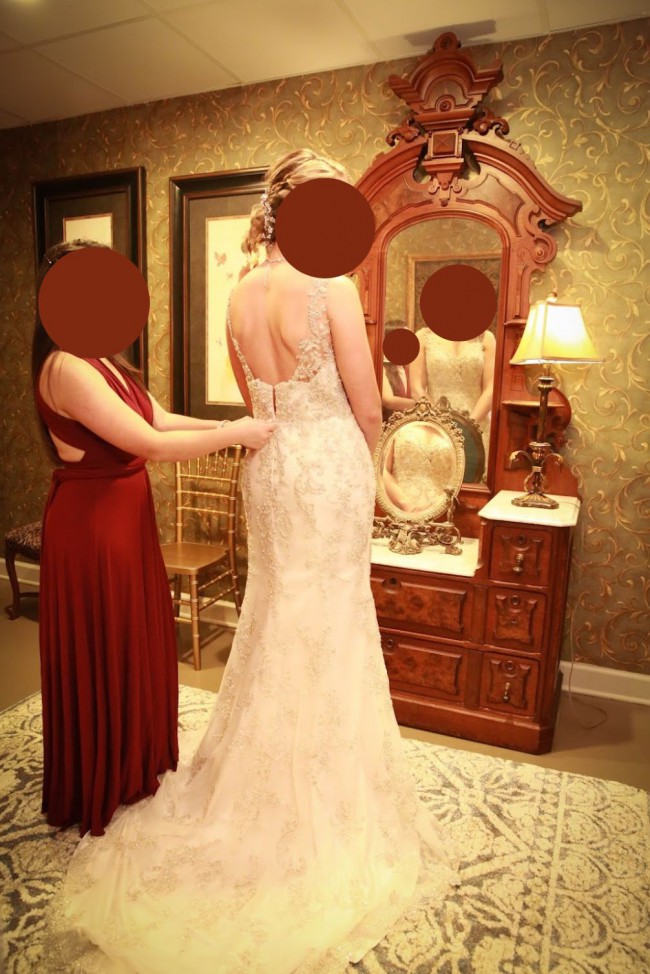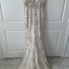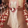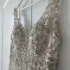 -"This bead-embellished sheath wedding dress features Swarovski crystals. The illusion straps and plunging V-neckline add statement-making glamour. Finished with stunning scoop open back and zipper closure."