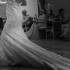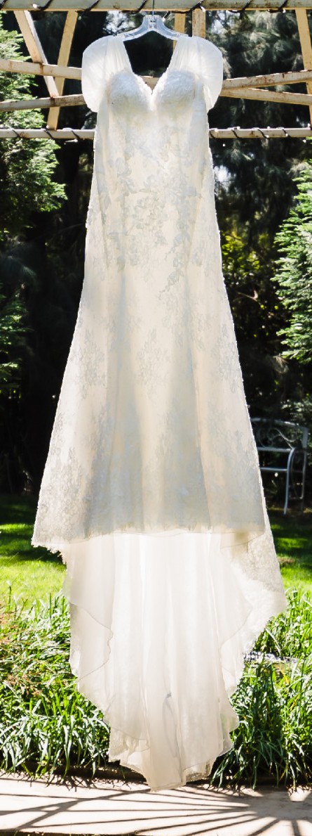Beautiful off the shoulder Ivory dress with low back and pearl detail.