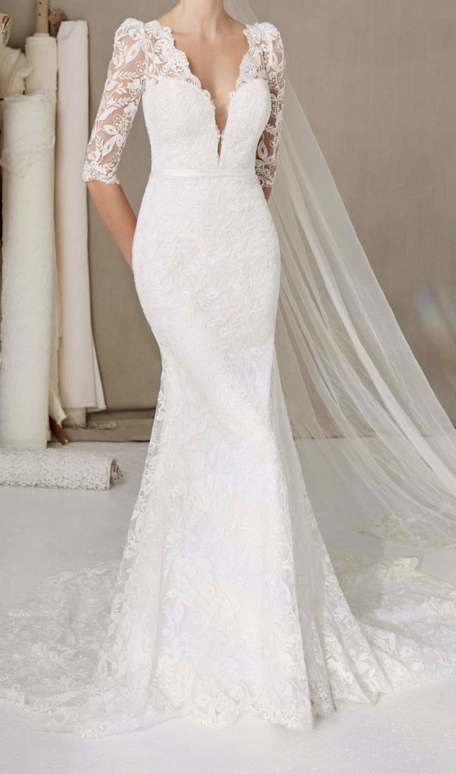Ellis Bridals - Hazel dress. Beautiful dress, loved every second of my time in it. Worn for a summer wedding last month but would suit winter season too. Fitted beautifully, I am a very standard size 12. Has been dry cleaned, in brilliant condition bar a few small spots of mud underneath the wedding train which are only visible if the train is lifted into a bustle.