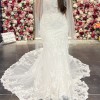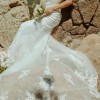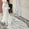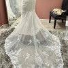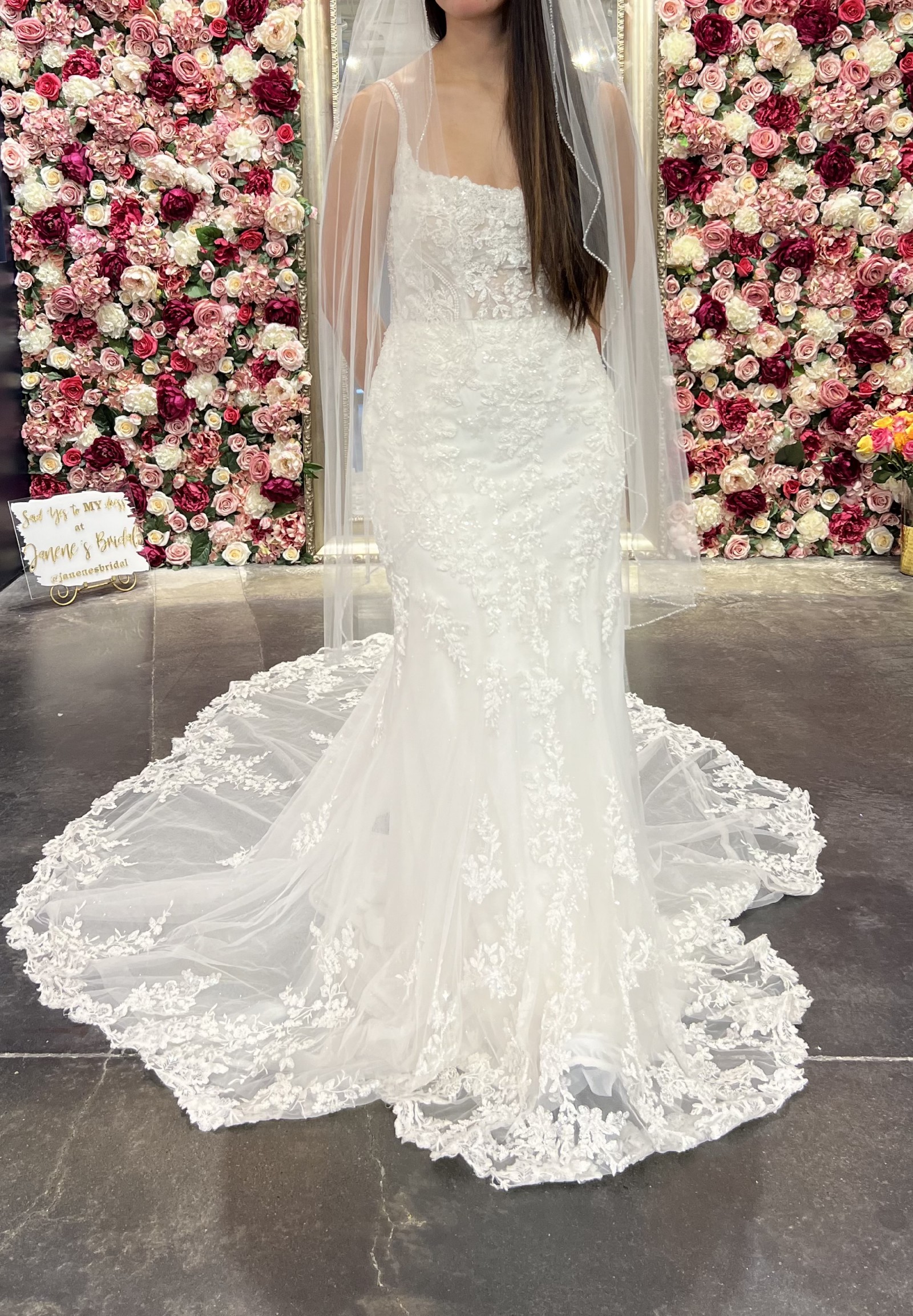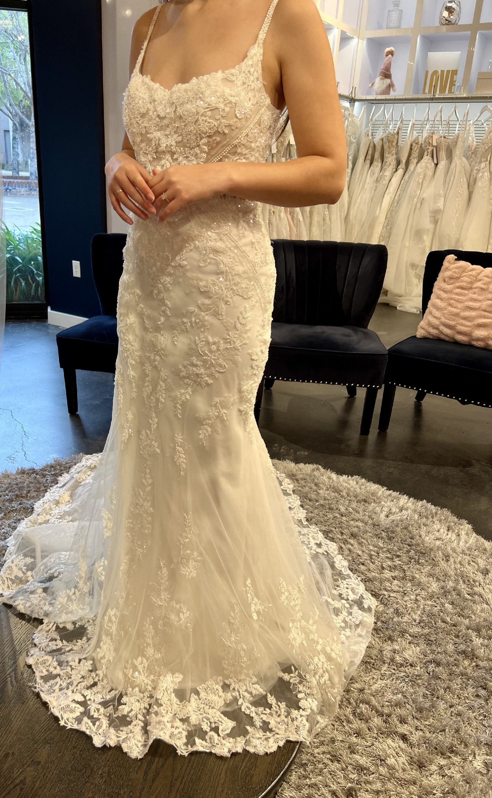 New, only worn to try on. Dress is ivory with ivory beading, lace and glitter tulle underlay, sparkles more in person. Illusion train with buttons, zipper closure and beaded spaghetti straps. No alterations and additional ivory lining purchased. Changed my mind after purchasing and bought another dress. Please reference official site for sizing charts. I was a size 4-6 in other bridal dresses, but size 10 for this dress. The perfect mix of timeless and modern. The square neckline gives this wedding dress an instant retro feel, calling on the glamour of Old Hollywood. The bodice is so beautifully textured, with layers of floral appliques and sparkling sequin details adding dimension throughout the gown. The chic fit-and-flare silhouette effortlessly hugs the body’s natural curve, flaring out into a subtly voluminous skirt below the waist. For an elegant bridal finish, the full train is adorned in stunning lace appliques, complete with an organic edge hem.