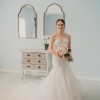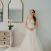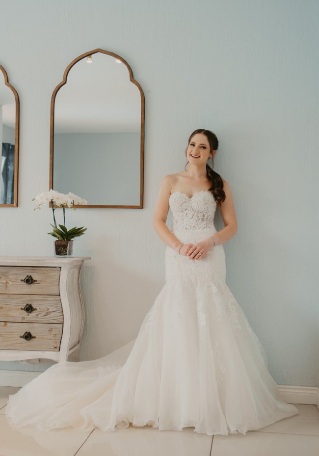 The Diosa Ivory Wedding Dress showcases a timeless silhouette, featuring a flattering sweetheart neckline and a fitted bodice adorned with delicate lace appliques. The flowing skirt cascades gracefully, creating a captivating and ethereal look as the bride walks down the aisle. Make a statement with this stunning Pronovias creation, and let your wedding dress be a symbol of everlasting beauty and romance.