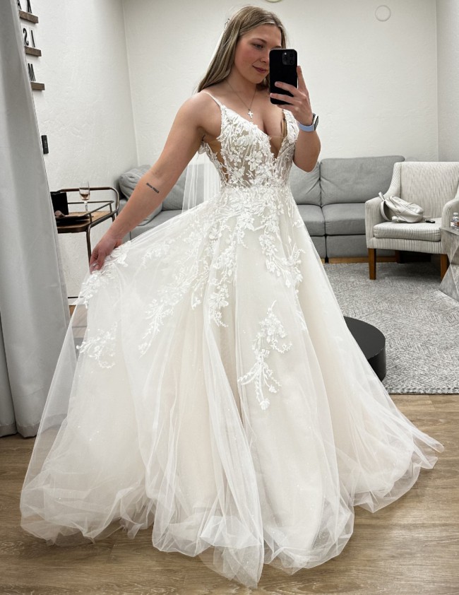 The Allure Bridals A1167 wedding dress radiates extravagance and charm. An ever-so-slightly dropped waist effect, created by curve-hugging sequined lace appliqués, trail along the bodice of this A-line gown. With exquisite floral motifs and a skirt that flows around you, you will turn heads and draw admiration with every step you take. So much detail, so much glam, but timeless and beautiful. I purchased this dress after originally thinking I didn’t want to wear the one I had, however, last minute I decided to wear a different one. This dress is brand new but altered. It has 5 layers of tulle, don’t let that scare you! A couple layers have an added sheen and sparkle, the beading on the body of the dress is gorgeous and subtlety and elegantly flows into the skirt of the dress. Small details in this dress create a big statement. Although modest, the low back has a flattering and sexy appeal. The dress is very comfortable and I really hope someone gets to love this dress as much as I do. Please use this link to see videos and more photos of the dress. https://allurebridals.com/a1167/