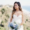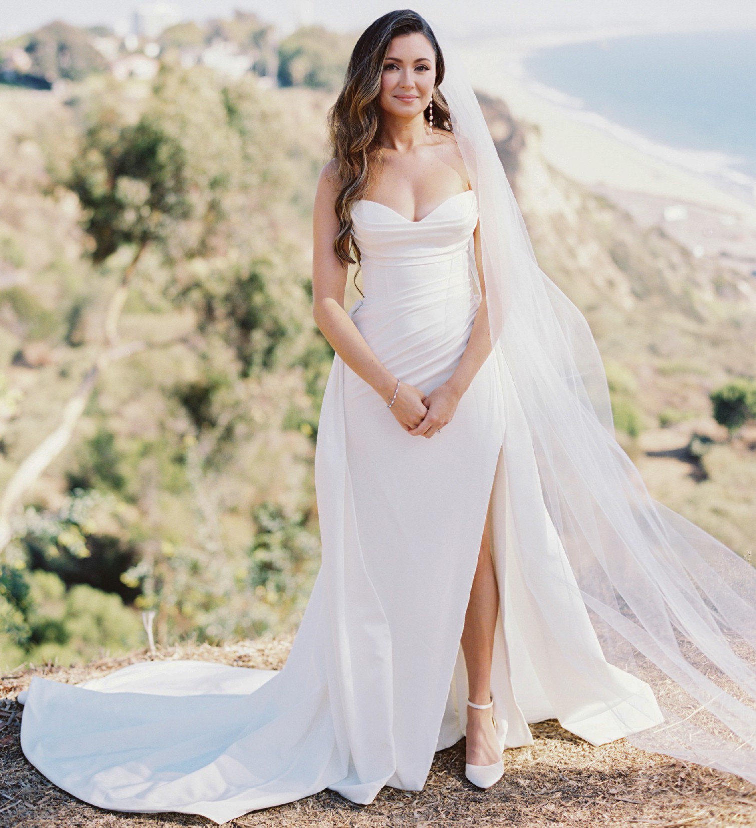 Length is 55" from the top of the bust to the front and 50" from the top of the back to the end of the train (this has a low back so it's slightly deceiving). I'm 5'7" and wore 3" heels.