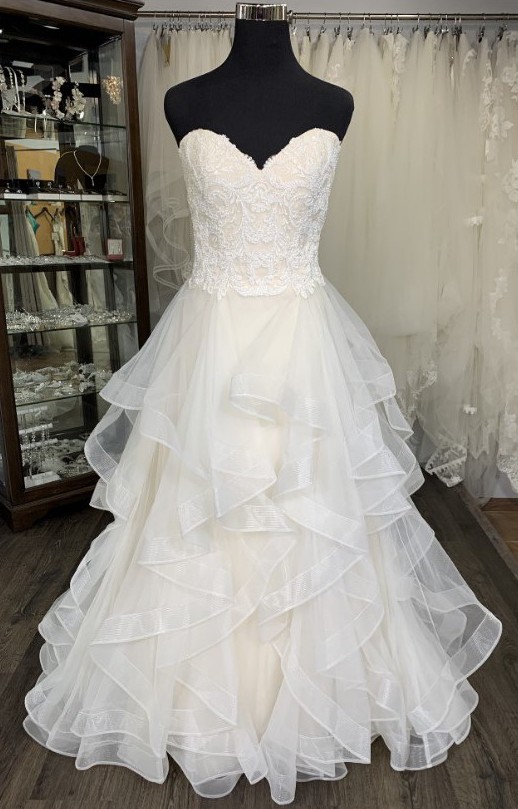 Brand new, purchased for my wedding, but found another dress I loved more. The fit is flattering, fun and flirty with the layered handkerchief tiers. I purchased new from this site (Stillwhite) from bridal boutique in Chicago. Tag stated dress was originally $1170, reduced to $936. I paid $640, selling for the same, which includes shipping US. The color is ivory, very beautiful bodice and can be bustled. This dress has not been altered, new with tags and dress bag for storage.**REDUCED!!! I'm willing to sell this dress for 1/2 off retail! $490 OBO, shipping US.