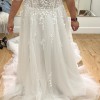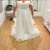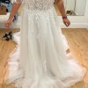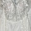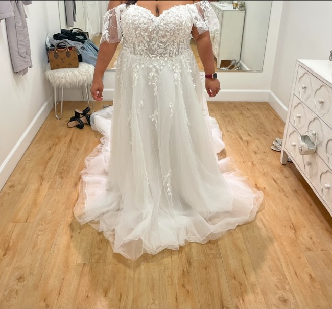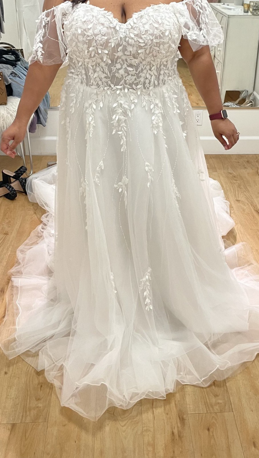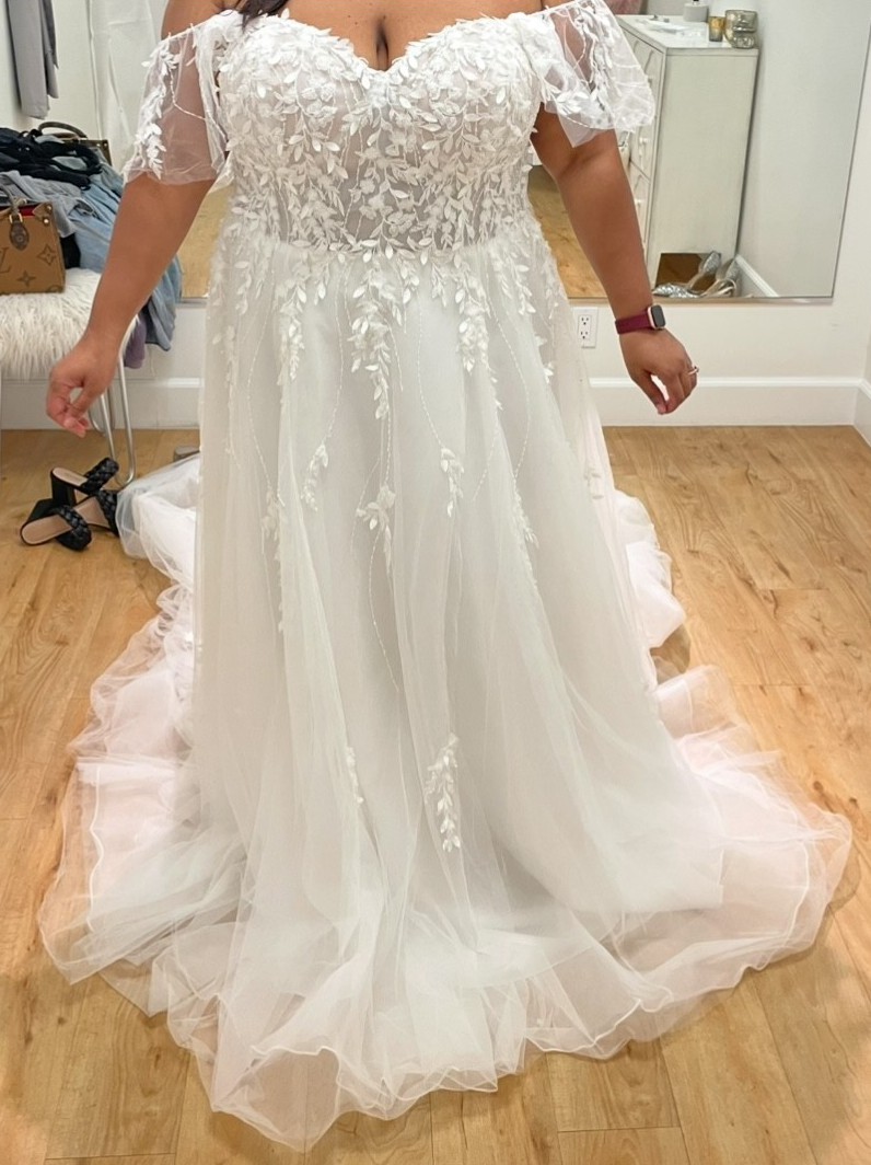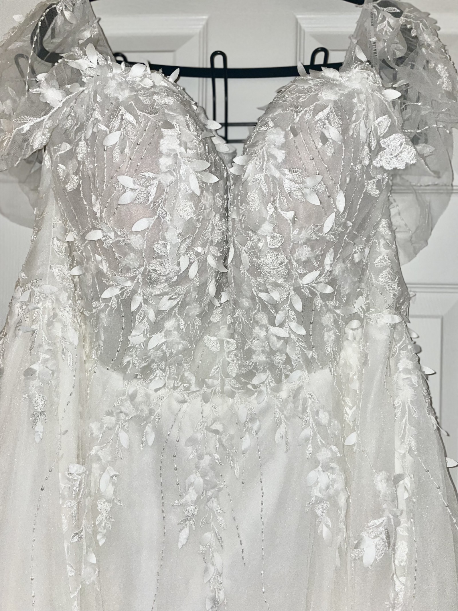 Detachable sleeves included which also has the beautiful leaf design with same tulle fabric. Can be worn on shoulder or off for a more boho feel. Protective garment cover from bridal shop also included.