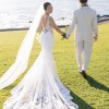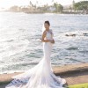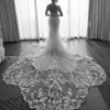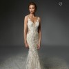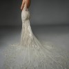 Floral, baroque lace with thousands of hand-embroidered beads and paillettes sparkles over delicate french chantilly lace, curving gracefully around the body to contour and elongate the silhouette. Figure-flattering, deep side cutouts reveal a subtle hint of skin, while a double layer, sculpted baroque lace train completes this dramatic look.