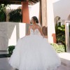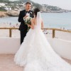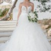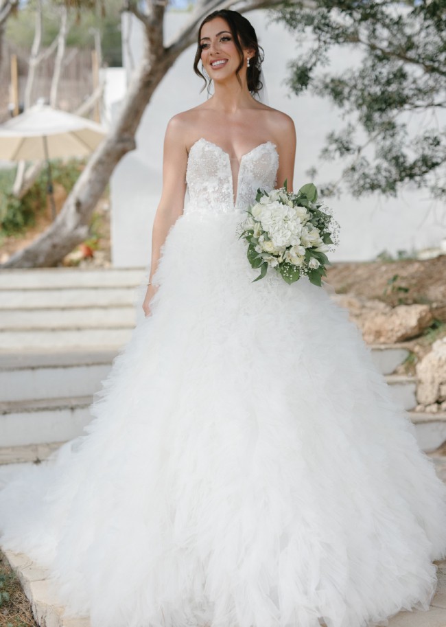 Style 1449 from Martina Liana is the wedding dress of every fashionista’s dreams. The extravagant, A-line couture ballgown starts with a V-neckline, which features stunning sequins and sparkling beading that showcase the décolletage and flatter the upper body. A sheer bodice highlights the luxe lace detailing and exposed boning, while the beaded double straps and twisted open back add another layer of glitz and glam. The grand finale of this fabulous gown is the voluminous, multi-layer feather and tulle skirt, which adds a fun, flirty element and creates frothy movement with each and every turn.