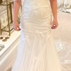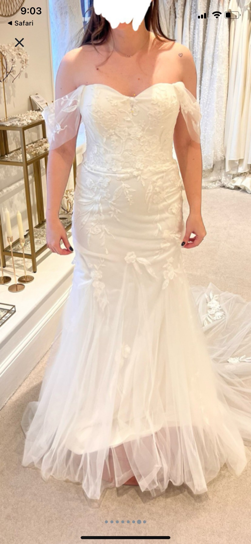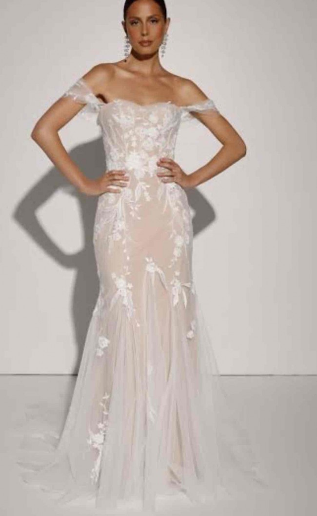 Lainey is the perfect combination of strong and delicate with embroidered modern 3D lace and a soft fit and flare skirt. Lainey is versatile for the bride who wants a more classic silhouette with detachable illusion pleated tulle off-shoulder straps.are removable