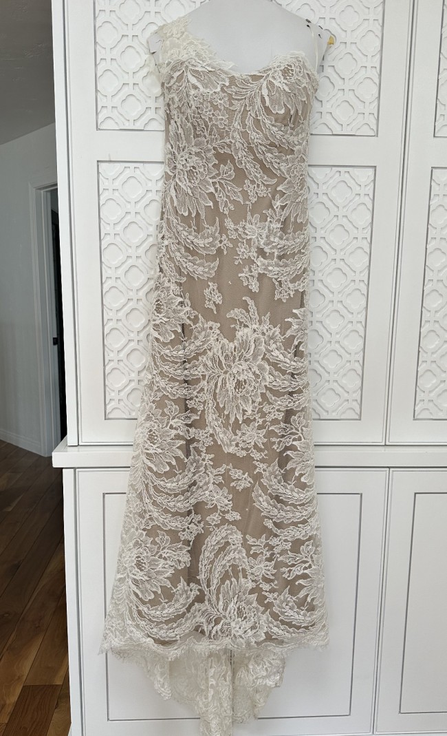 Biana is a column hand corded large peony pattern French Leaver's Lace gown. The soft white lace is recrafted over a nude silk charmeuse under gown in champagne. While the under gown is a strict soft column, the lace flows away from the column just above the knee as it forms its unique dramatic train. The scale of the Leaver's Lace allows reworking the motifs of the lace to paint the body line, a hallmark of Anna Maier design. Covered buttons extend from the back neckline to the hem and are functional to cover the zipper. The back neckline is approximately three inches above the waist. Bianca retails for $5,800