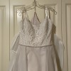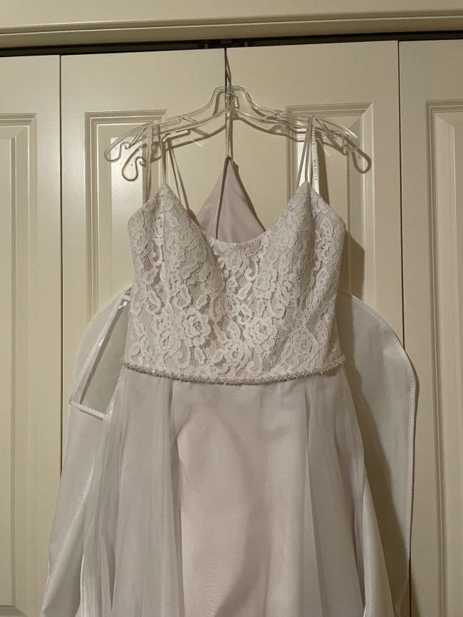 Pictures show the dress worn by a model and how it looks in person. I bought this and then decided to wear a different one for my wedding.