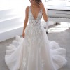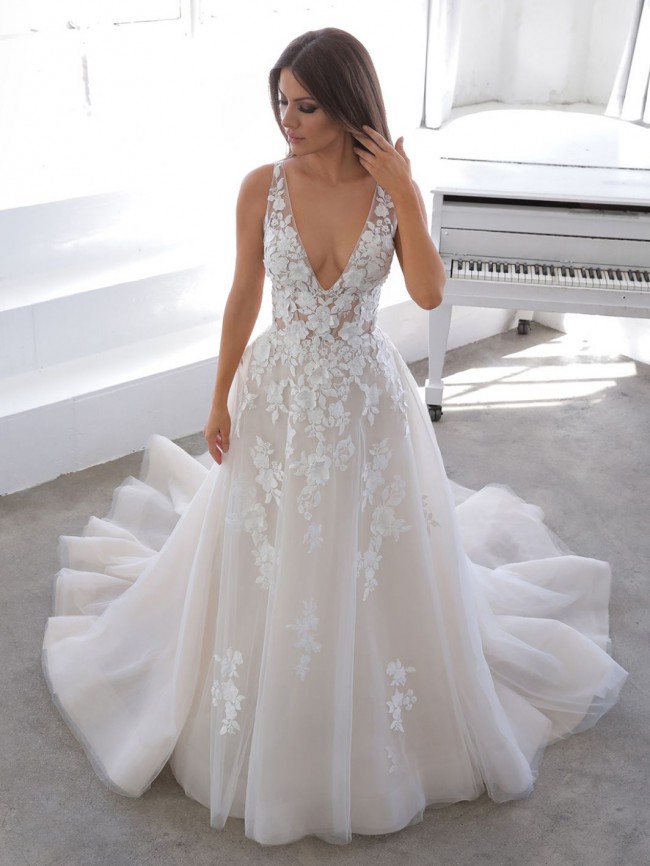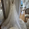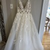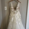 Beautiful full alone gown with 3D flowers. This flowing gown give romantic garden vibes which a classic feeling. In perfect condition with no stains or tears. This gown is in perfect condition as it was a sample. It has been cleaned and ready to walk down the aisle.