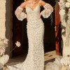 Dailyn is a discontinued Madi Lane style adorned with 3D florals throughout her sheath silhouette. She has optional balloon sleeves with matching 3d florals. This was a Sample worn in my Bridal Shop only and still has tags attached. The color of this particular style is Ivory with a Latte lining.
