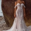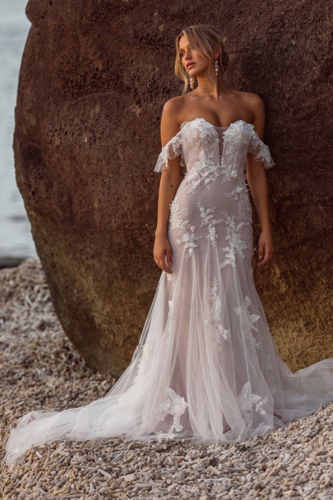 Junie by Madi Lane is whimsical and romantic fit and flare gown with detachable off-the shoulder straps. She is made of a super light lace and tulle and lined in a buttery silk charmeuse. Worn as a Sample in my bridal shop only, in great condition. Colorways are Ivory/Mocha