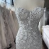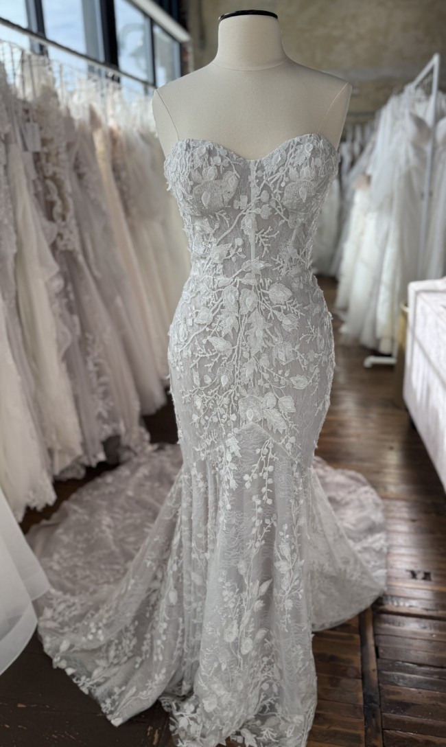 Penny is a jaw-dropping gown of layered floral laces! This fitted silhouette has a structured bodice with a sweetheart neckline, illusion back, + a long, statement train that adds a picture-worthy touch!