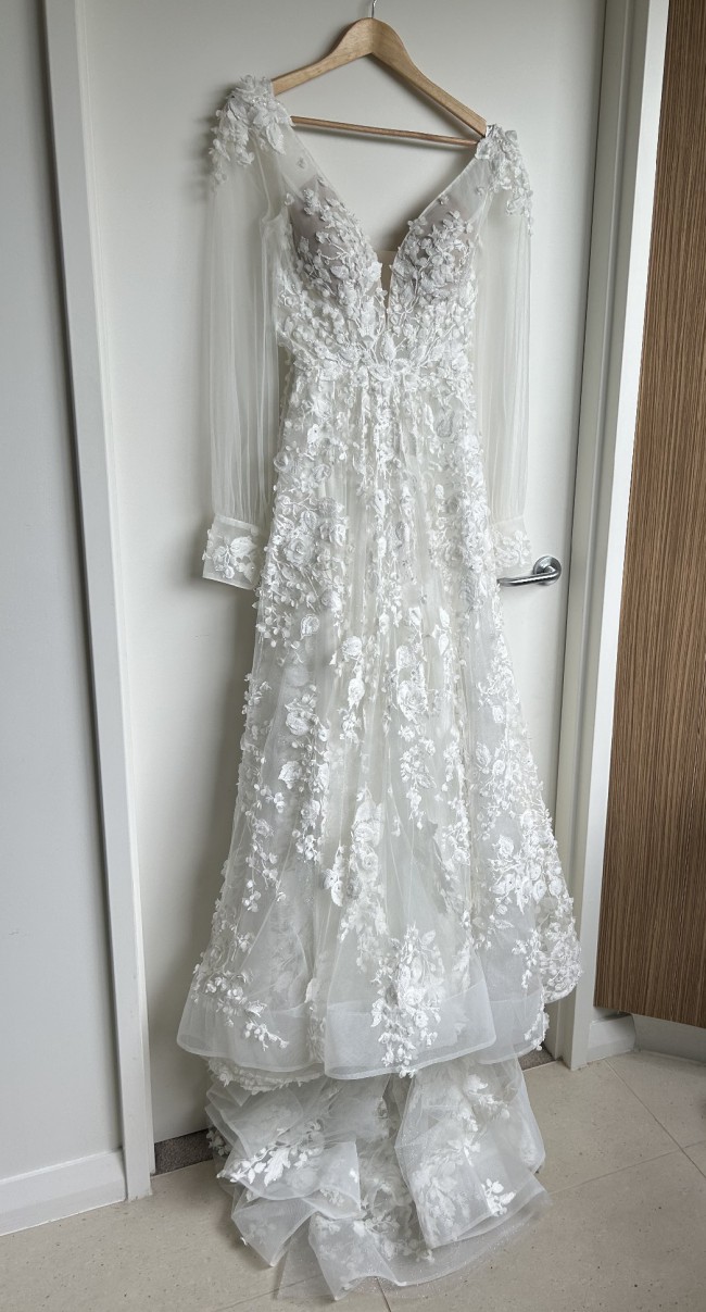 I bought this dress to wear to my wedding but decided to have a casual elopement instead, so I didn't end up wearing it! It has been dry-cleaned by the previous owner and is spotless, still feels brand new.