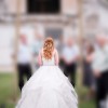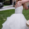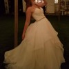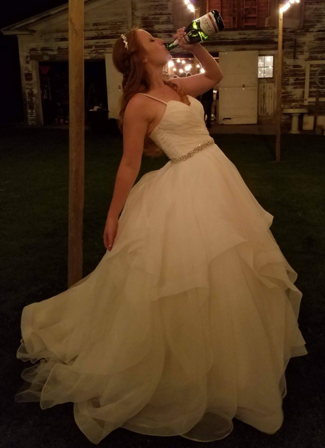 This dreamy organza ballgown wedding dress features a layered flounced skirt with horsehair trim and a sweetheart neckline. The way it floats down the aisle and spins and twirls on the dance floor is purely magical. I've added layers and layers of stiff tulle underneath to really give it that lifted look, however it doesn't feel heavy! It has a detachable crystal rhinestone sparkly satin belt. It does have a spot to bustle. Fitted/little stretch up top, the dress "sits" on the waist and flows out from there so my hip/thigh size could never be an issue. I'm 5'8" and wore with cowboy boots.