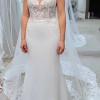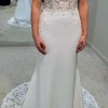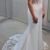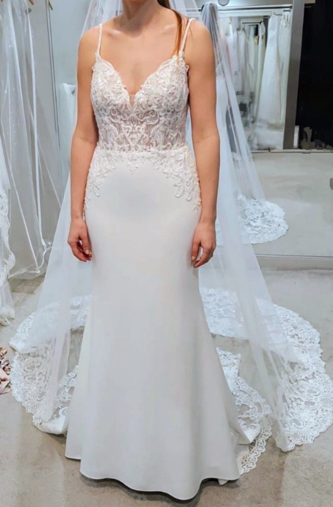 The dress is beautifully designed with a sheer bodice. This is complimented by modern ornate lace and a soft crepe skirt, finished with a cut-out train. The sparkling crystal & pearl threads across the back of the dress are attached using poppers, these can therefore be removed if you wish. The train can also be clipped up, if desired.