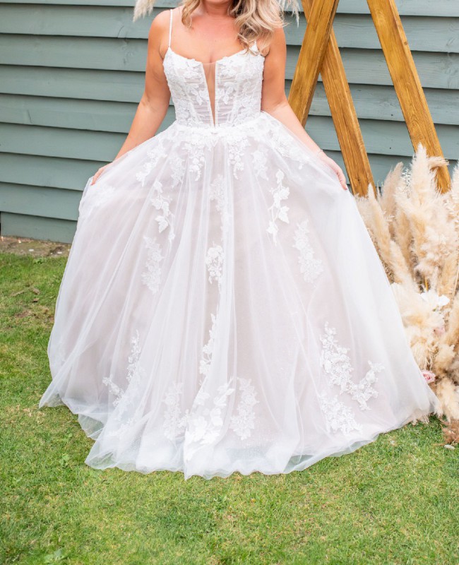 Stunning dress by Justin Alexander paid £1700. Has a blush underlay and 5 layers of tulle colour ivory latte